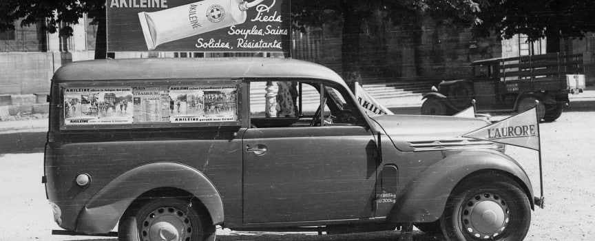 Akileine Oldtimer mit Werbung auf dem Dach
